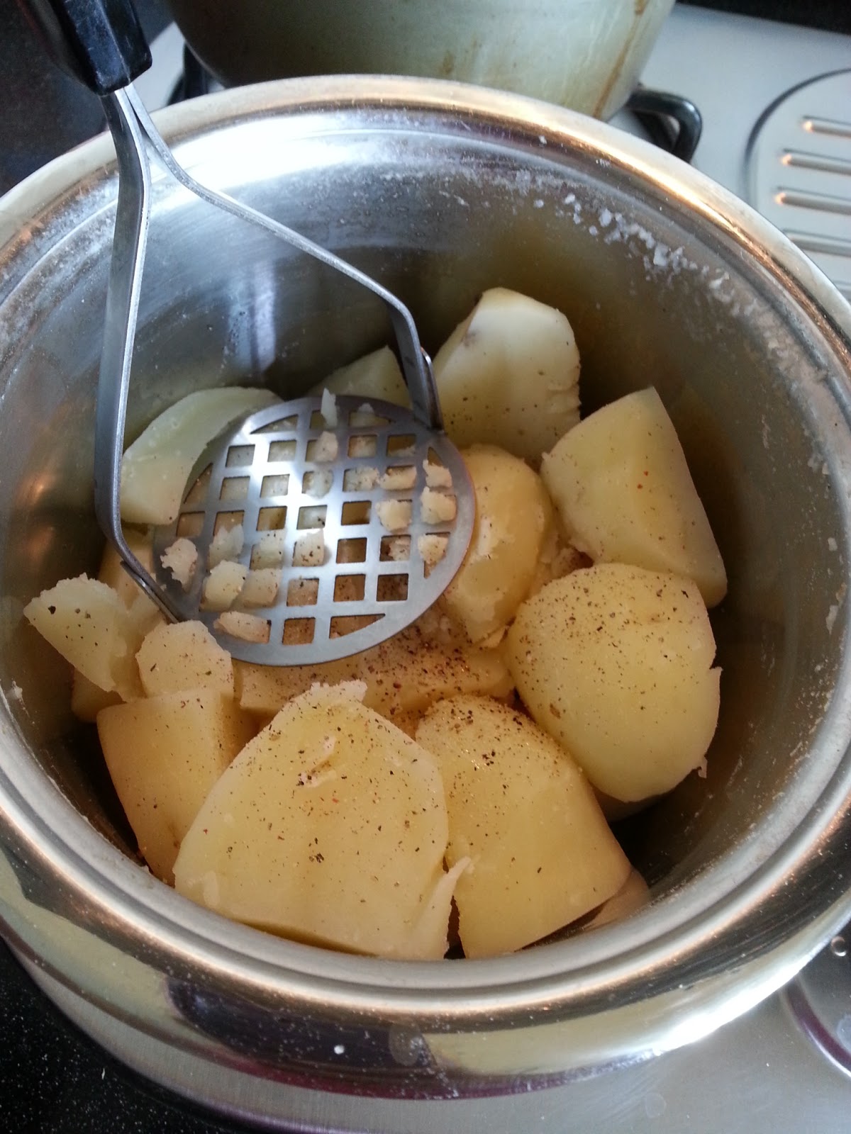 Add in margarine/butter, 3-4 tbsp of milk, salt and pepper to taste.