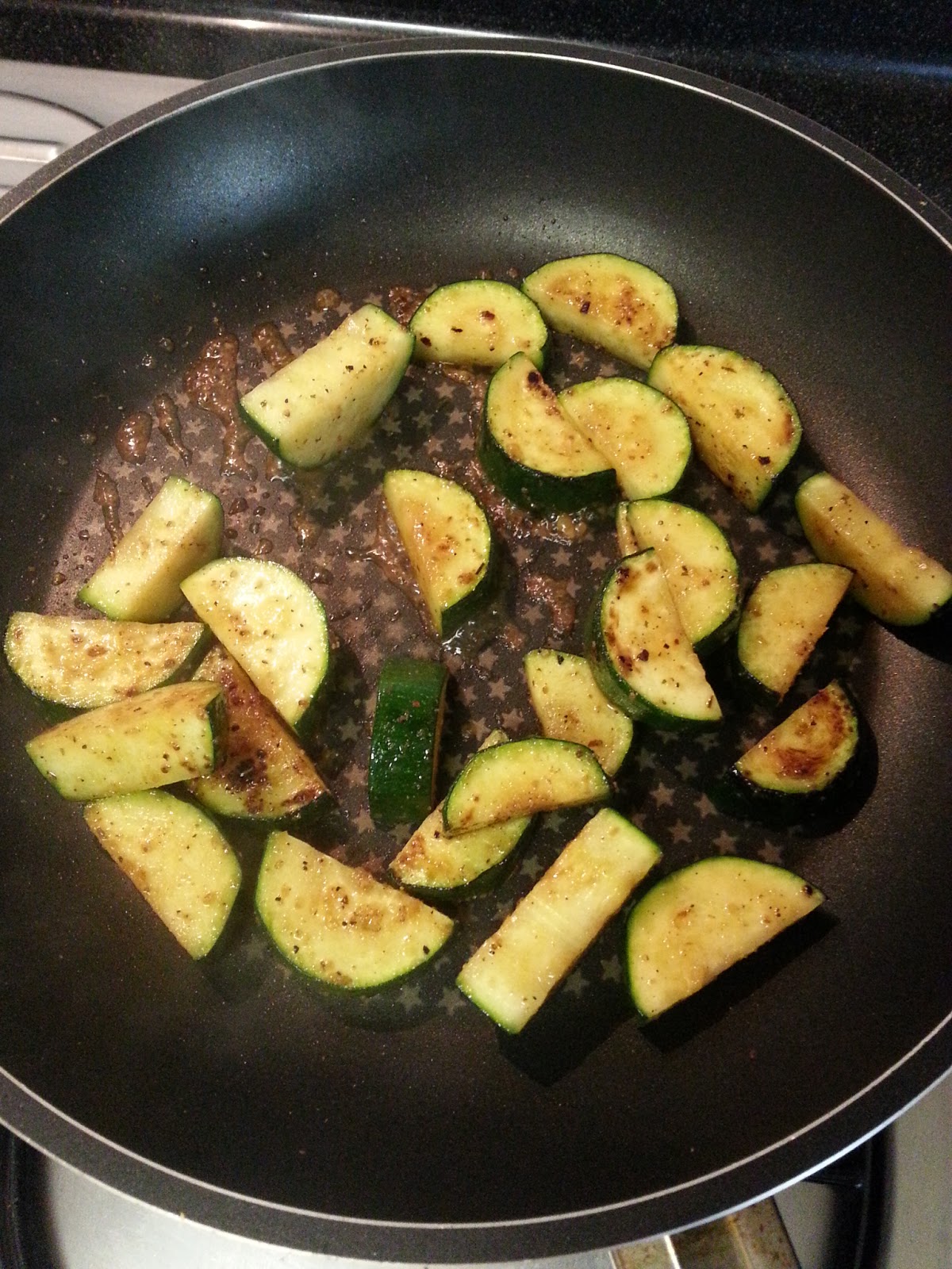 Meanwhile, heat pan with EVOO to med-high heat, and pour in the zucchini