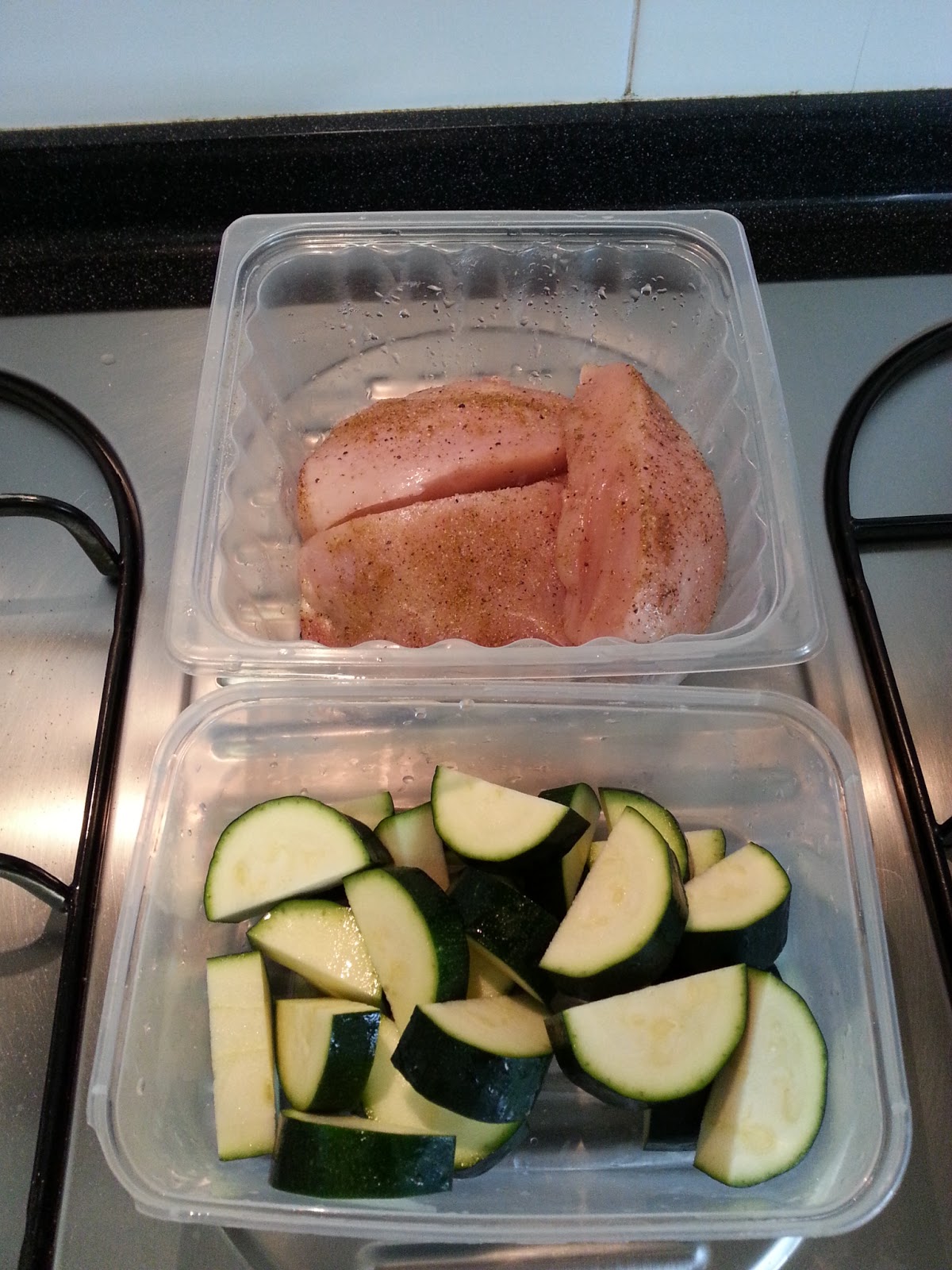 Cut the zuchinni length wise, and slice it to 1/2 inch pieces