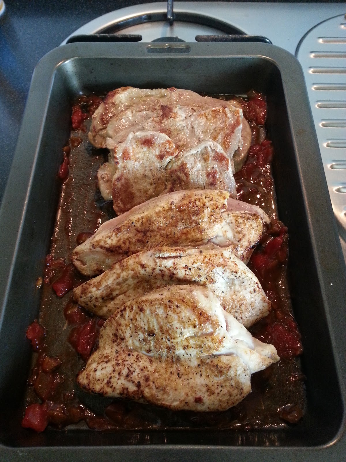 Brown both sides of the pork and chicken