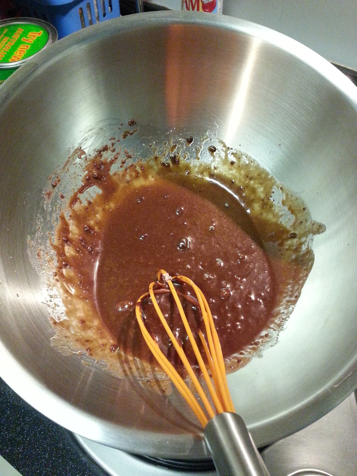 Here my aluminium mixing bowl is sitting resting on my saucepan, and the saucepan is filled halfway with water simmering away on my stovetop.