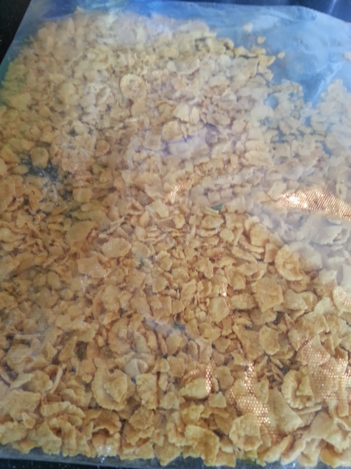Crush with hand or use a rolling pin to crush cornflakes into about 1/4 of it’s size.