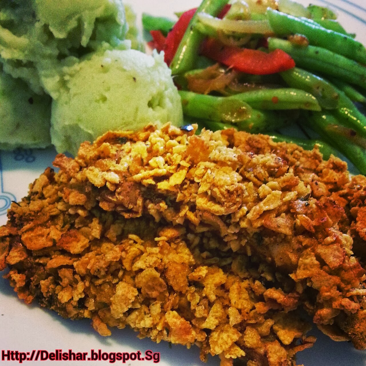 I’ve been craving fried chicken but I refuse to cave in to deep fried oily food. So I made my own version of ‘fried’ chicken instead, using cornflakes for the crunch and marinated in the ultimate spice mix! The husband gave me thumbs up and a big kiss for making him this yummy dinner! *blush* This is a good healthier alternative to the regular unhealthy fried chicken, and it is something I would feed my kids too! Serve with Avocado Mashed Potatoes and a side salad for a complete meal.