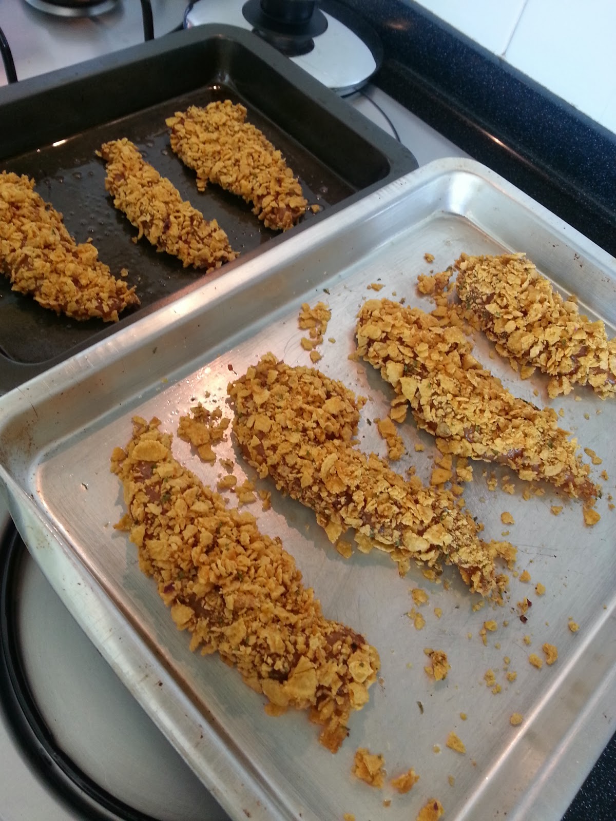 Bake for 10-13 mins or until done depending on the size of your chicken tenders, and cornflakes are golden brown. I did 10, and my chicken tenders were pretty small (the ones you get from NTUC).