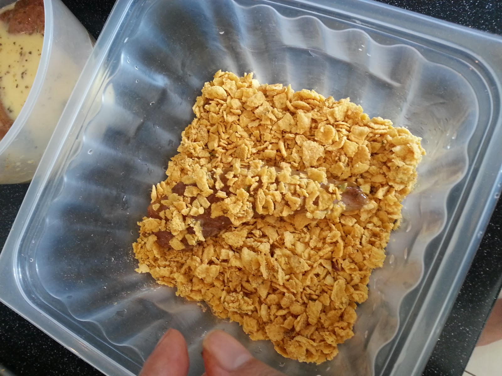 Or pour cornflakes out onto a plate or container and use hand to coat chicken with cornflakes.