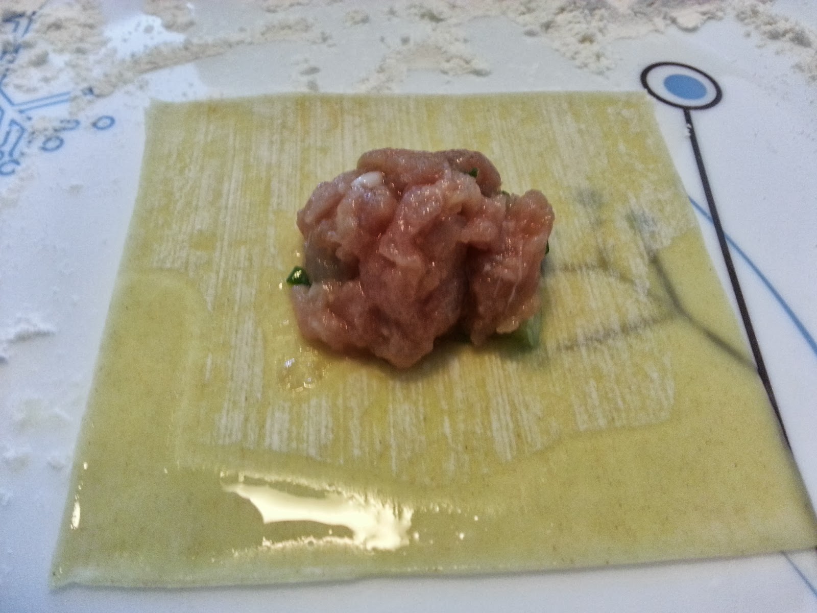Set up wrapping station. Dust plate and tray with a little plain flour so that the wanton will not stick.