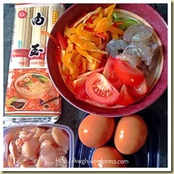 tomato, blanched prawns, blanched chicken breasts, egg strips, chopped