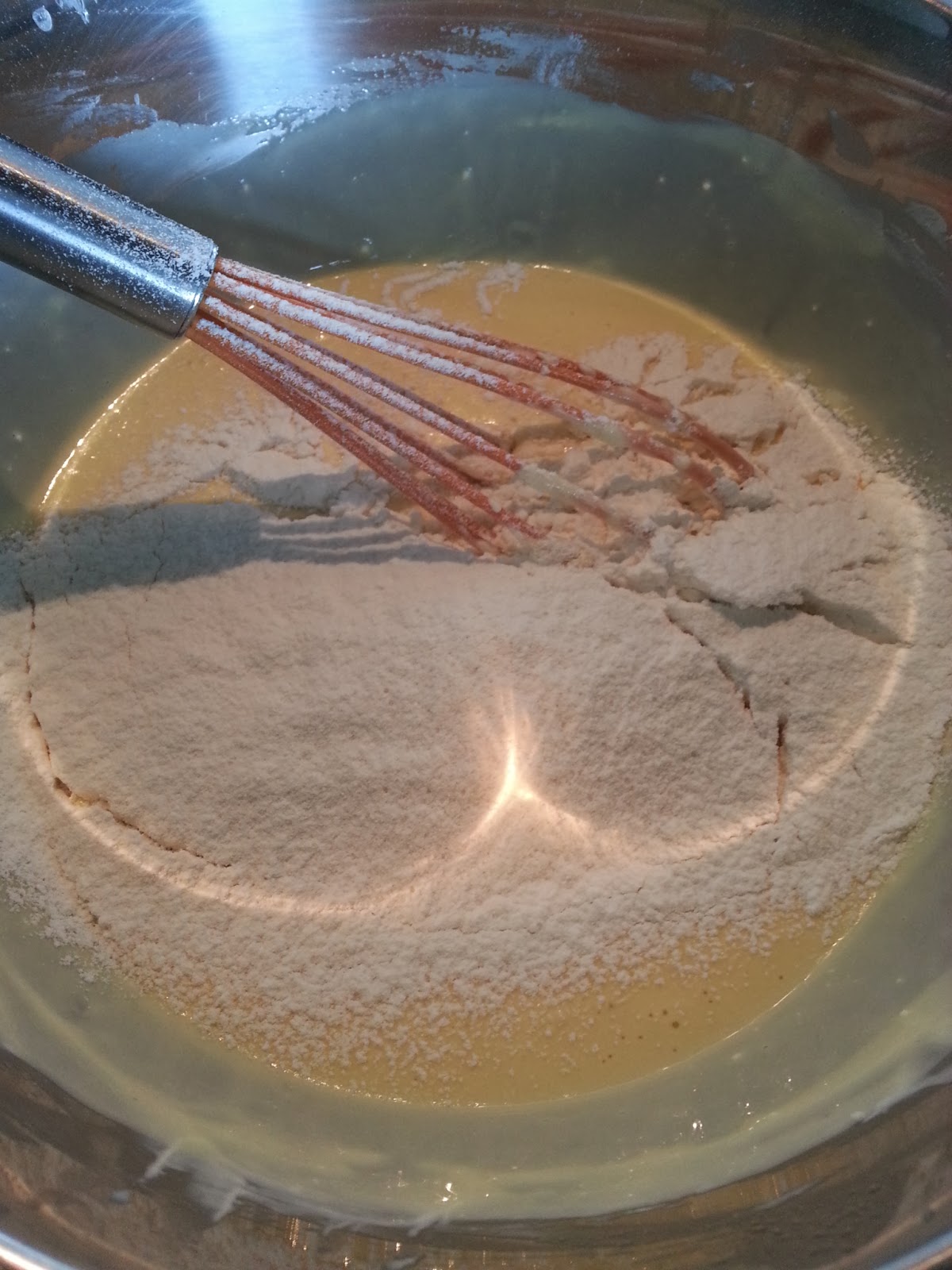 Fold in the other meringue into the other bowl of yolk mixture to get the yellow batter.