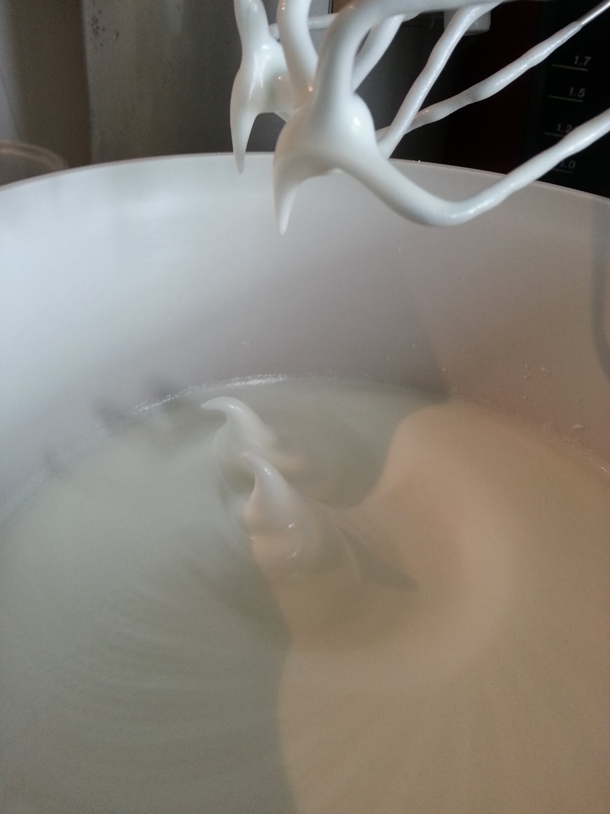 Meanwhile, beat egg whites until foamy, then gradually add sugar, and continue to beat until you get soft peaks. The top of the peak will bend when lifted.