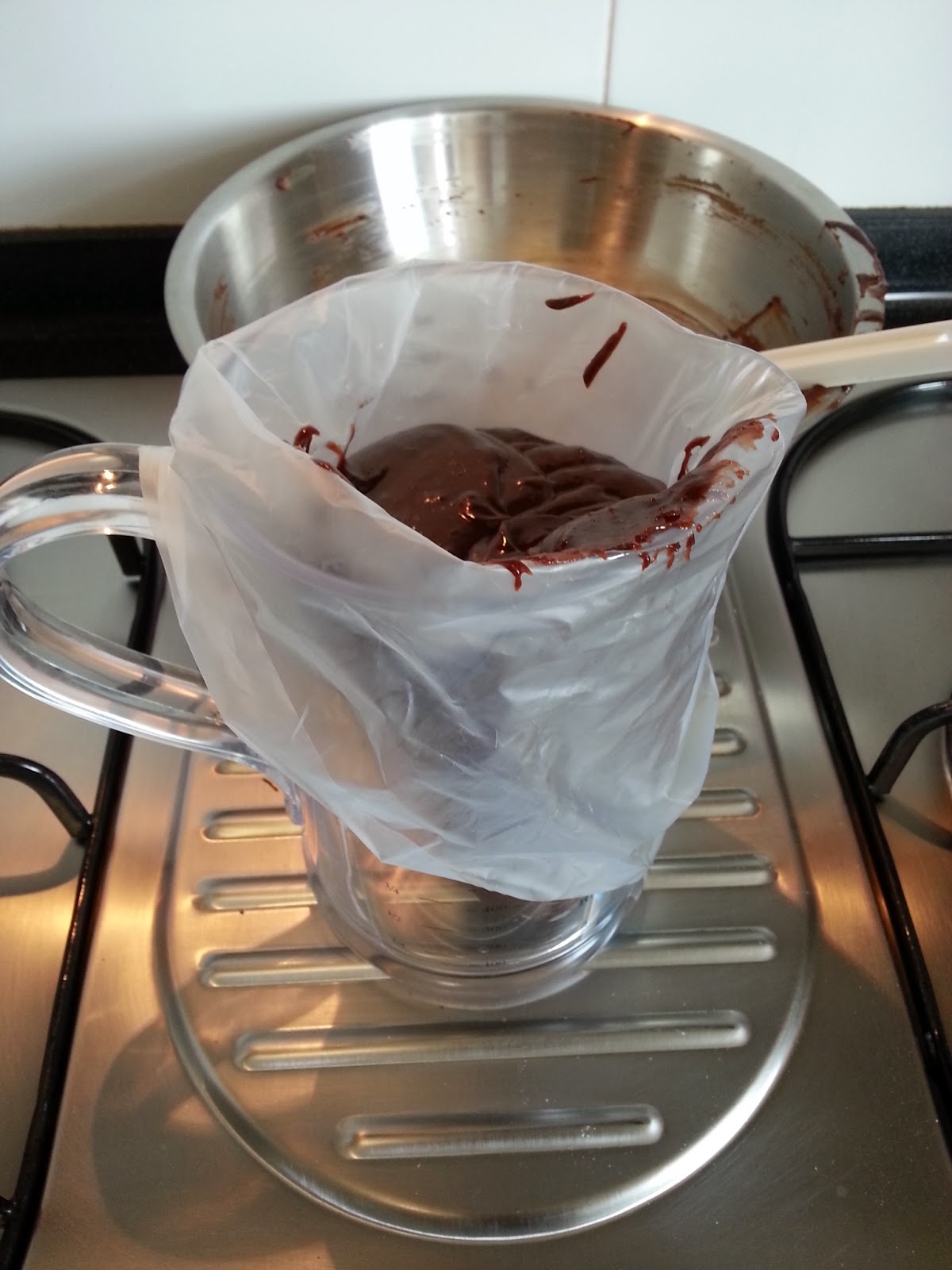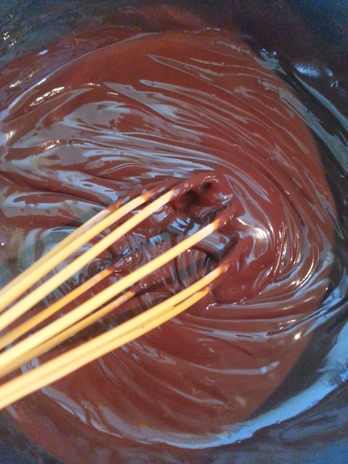 When chocolate mixture is cool to touch, add vanilla and eggs.