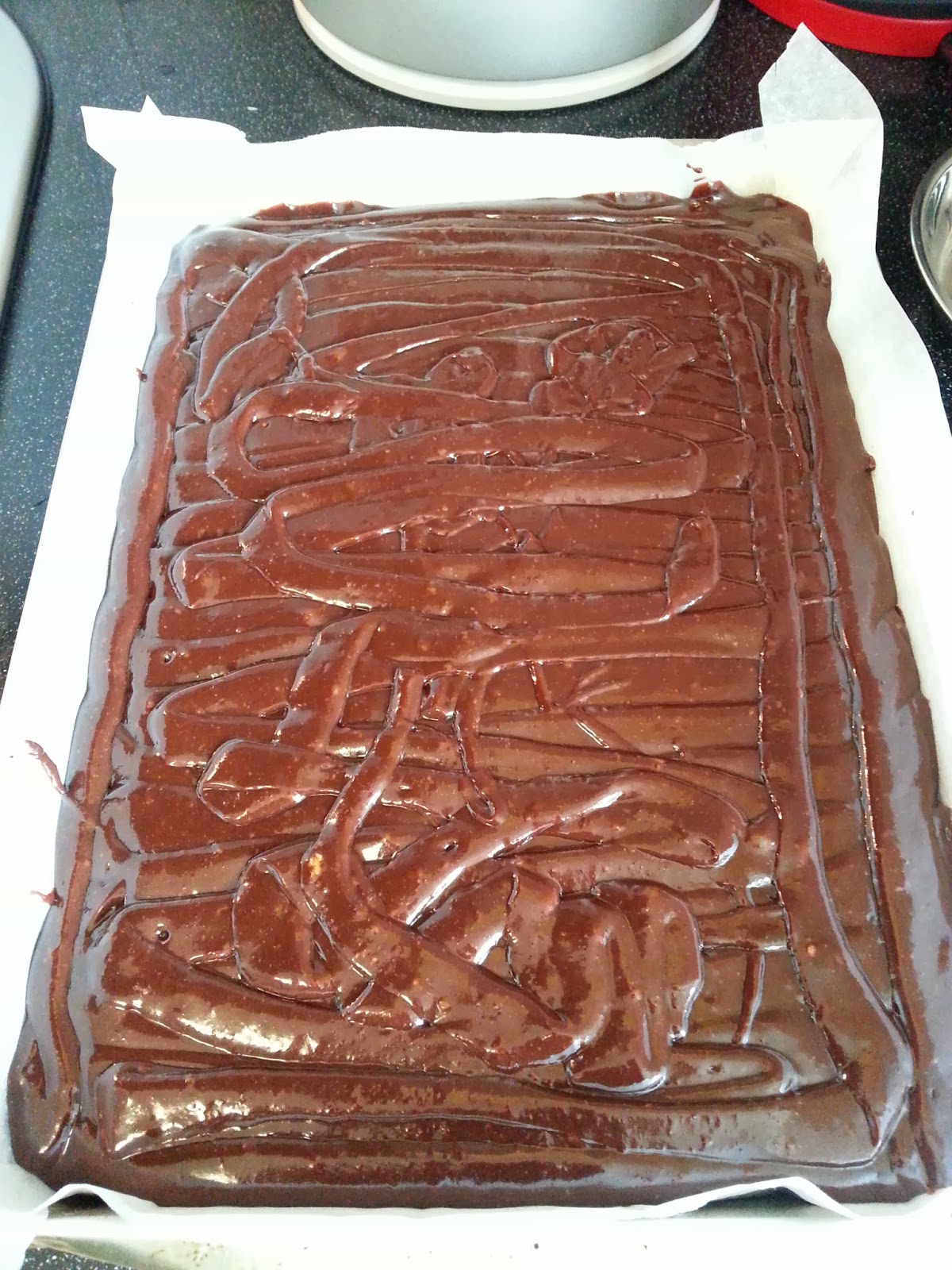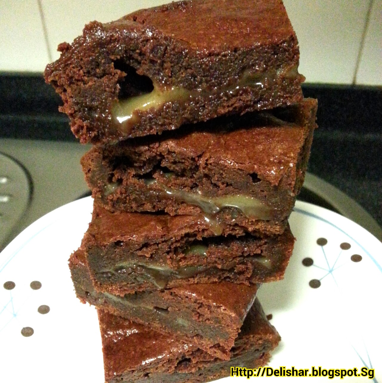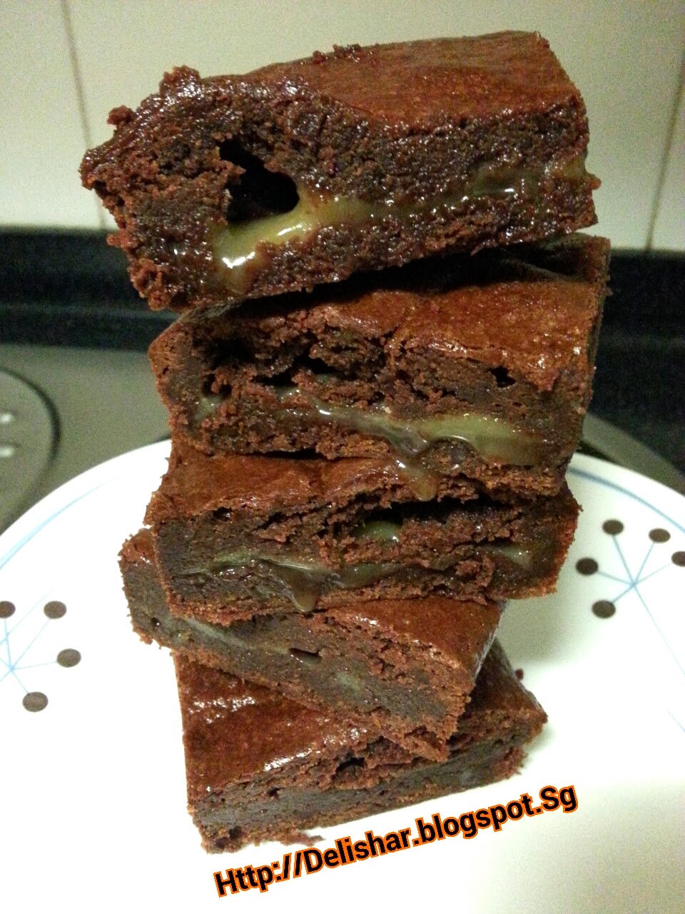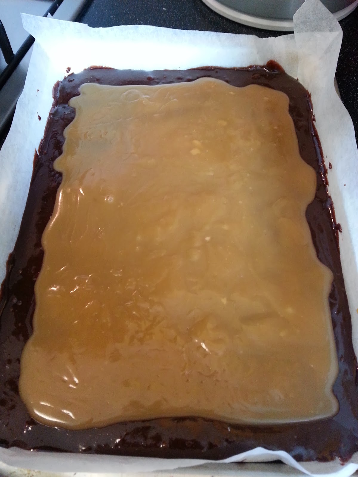 Drizzle (or in my case, I used a ziplock bag and snipped of the ends) the salted caramel sauce on the brownie batter, leaving about 1/2 inch away from the side clear. This will help to seal the sauce in.