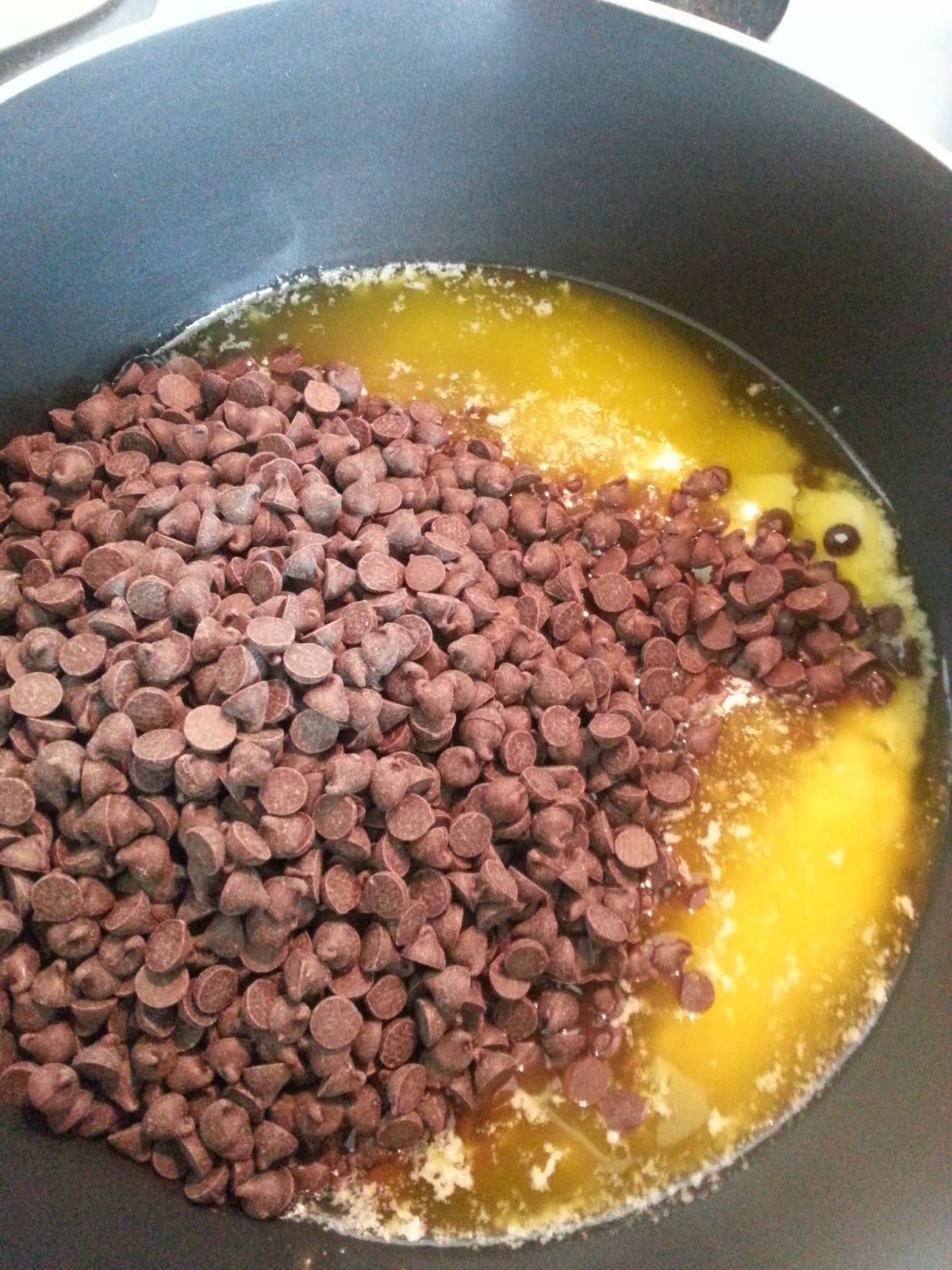 Once butter is all melted lower heat to low and pour in chocolate chips.