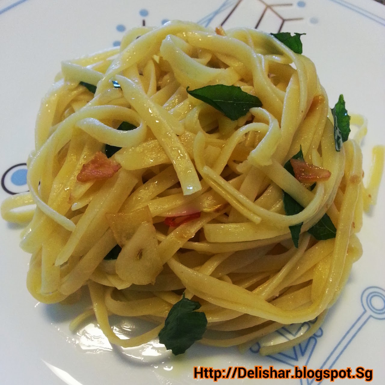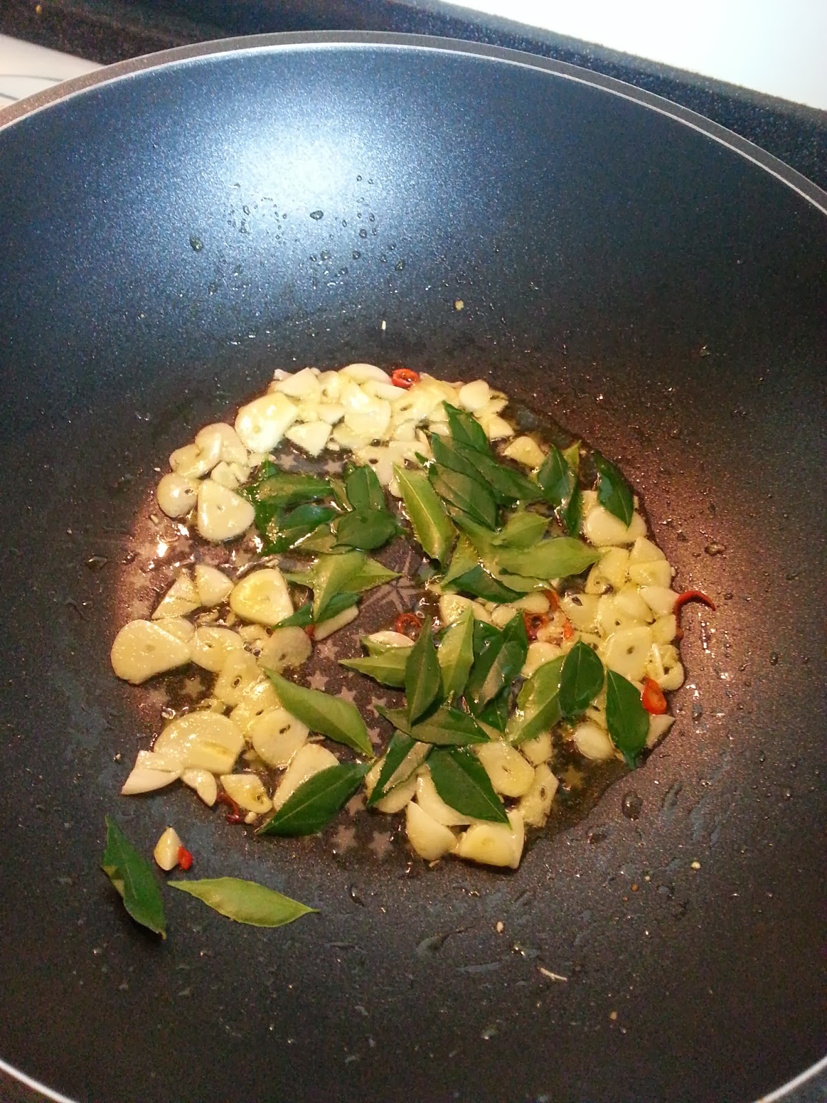 A very nice neighbor gave me a bunch of homegrown curry leaves and I was kind of craving for cereal prawns! But then again, we had rice the day before so I felt I had to come out with something pasta-ish for le husband. It was definitely an experiment for me but the result turned out superb! I paired it with Cereal Prawns to complete this fusion meal. I used (only) about 1.5 chilli padi for this meal and the husband was already sweating like a pig. So glad I didn’t use the initial 3 chilli padi i took out from the fridge or he may have died from a spice stroke. So please, adjust it to your level of spiciness. 🙂 For me, it was mildly spicy, for my ang moh… it was numbing. 😛