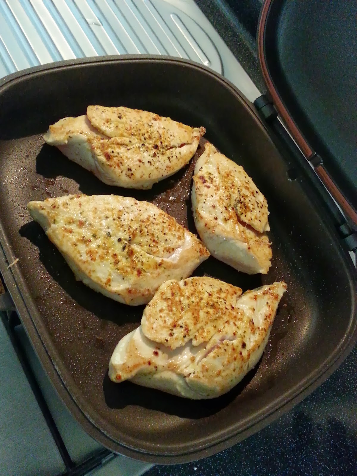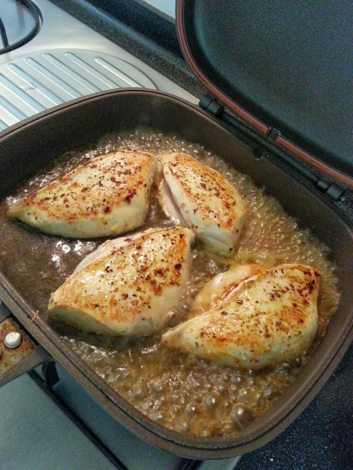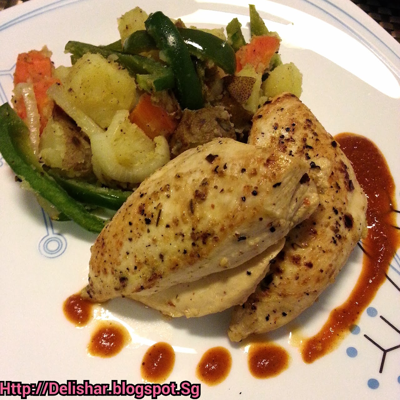 A quick and fuss free dinner. Searing the chicken locks in the flavour and moisture, and cooking it in chicken broth helps to keep the chicken extra moist. A great technique to use, especially when working with tough chicken breasts. This dish is really quite ordinary but the Curried Roasted Red Pepper Sauce added a wow factor to it.