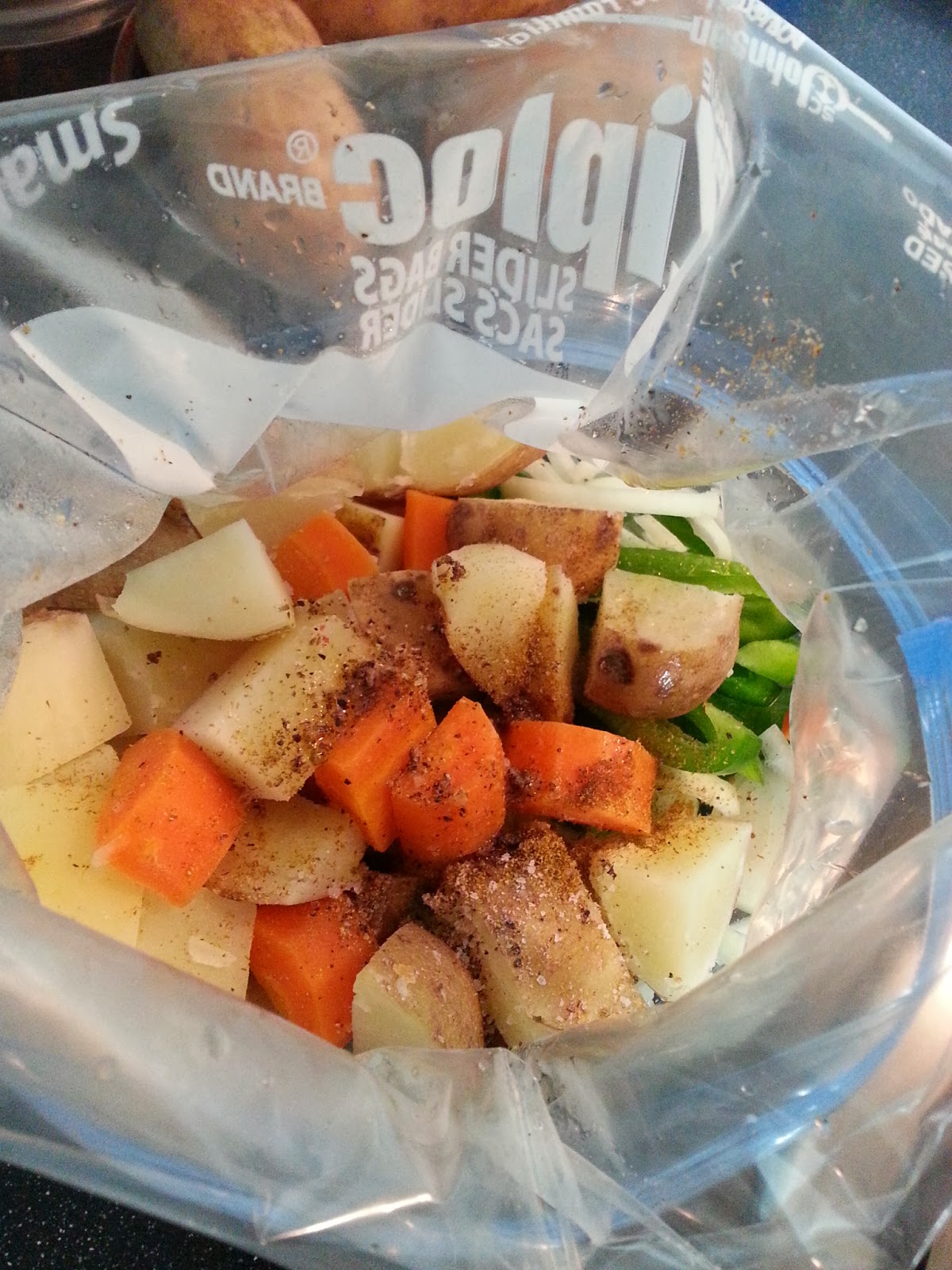 In a large ziplock bag, toss together 2 tbsp of oil, salt, pepper, potatoes, carrot, onion, green pepper.